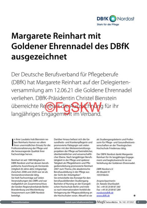 DBfK Nordost und hat dessen berufs- Tätigkeit als Pflegelehrerin und Pfle- Verleihung der Goldenen Ehrennadel.